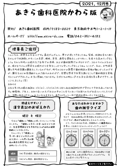 当院では院内新聞「あきら歯科医院 かわら版」を発行しています。クリニック内では配布しております。各号の画像(PDFリンク)をクリックしてご覧いただくことも可能となっております。